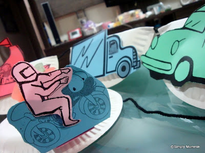 And here’s her art for the day (a pull-along art piece of a boat, truck and car and two motorcycles that can revolve on the plate):
