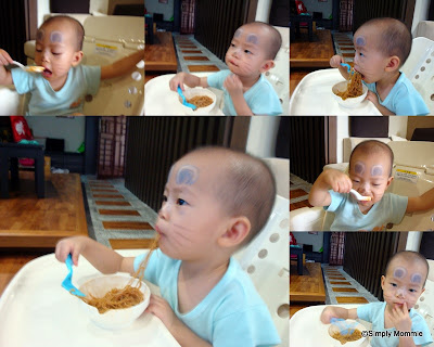 And here she is, playing with the cutlery in her chair before I got some noodles from my packet of wanton mee for her… such a playful mouse! (ooh, did I mention that I can actually get her to sit in her chair for meals now? π )