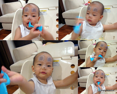 It’s the last day of Mandarin PlayClub for the term and it’s the last lesson for Alicia too since she’s only gonna continue with the Bilingual PlayClub next term. Hence, to spice up the partying mood, the teacher drew a mousey face on Alicia – which is really quite appropriate since she’s born in the year of the rat. Isn’t she cute? π