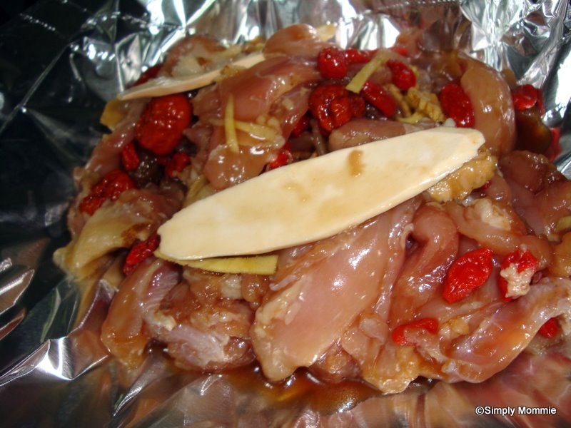 2. Place the chicken meat and all the ingredients on a piece of aluminium foil. Seal the ingredients and place the packet on a plate.