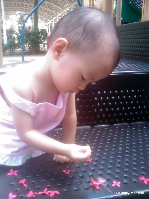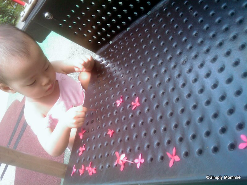 Alicia, being the nature-lover that she is, was thrilled to see sooo many flowers and she started to fiddle with the flowers and ‘decorated’ the playground: