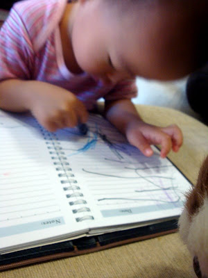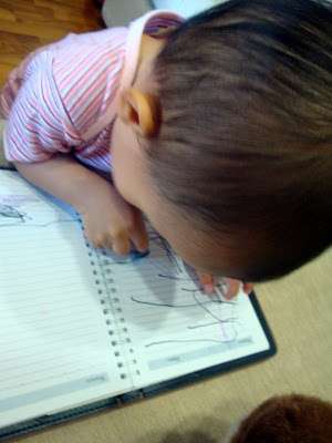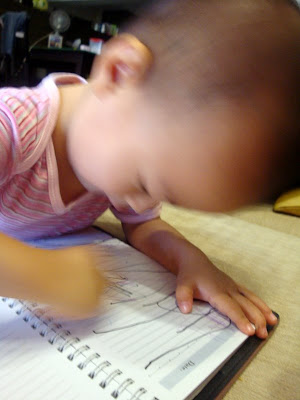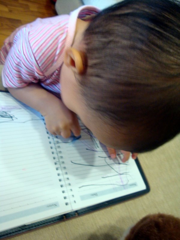 Recently, she also discovered the pens and markers in the drawer of the coffee table and insists that she must doodle with them too… and since she’s so into doodling, I gave her a book specially for her newest hobby – it’s an old unused planner which I’ve been keeping for her use 🙂