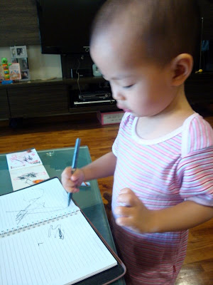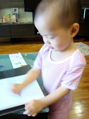 Alicia really loves drawing and colouring these days and ‘draw’ and the different colours of her crayons are among the most used words of her vocab… Her current favourite colour is ‘white’ – I don’t really know why since the colour isn’t obvious on white paper – and she’d look for the white crayon purposefully and start colouring with it.