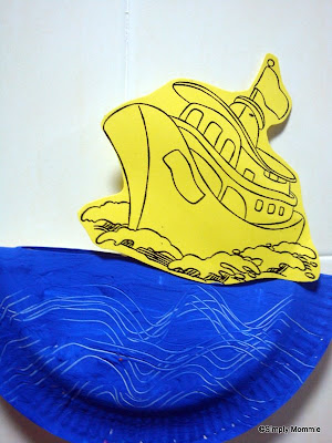 The boat is attached to a disposable chopstick and the paper plate has a slit in the middle so you can move the boat horizontally!