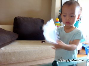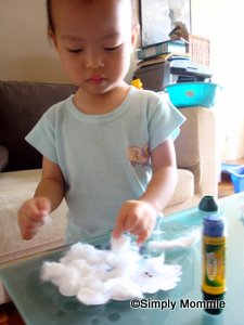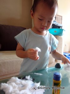 ย 4. Tear the cotton ball into small bits with tot. This is great for fine motor skills!