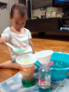 Scooping on her own – and she could in fact scoop water into even the narrow-neck bottles without the help of the funnel…ย