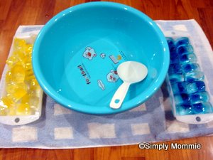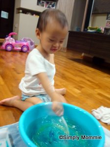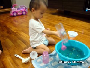 Get your tot to name the colour of the icecubes first and touch the icecubes (sensory)