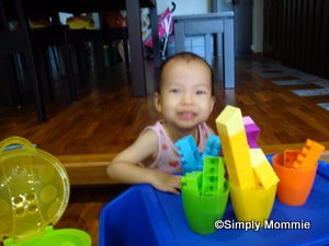 This was what she decided to do the other day (8 Nov) with her blocks and my Ikea cups: