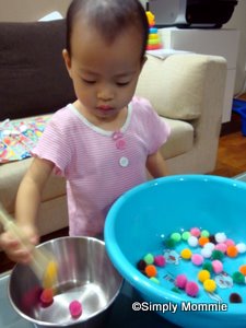 As mentioned in the previous post, here’s the follow-up tonging session after I managed to buy colourful pompoms! Makes tonging so much more interesting as she can tong according to colours!