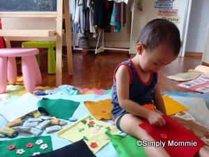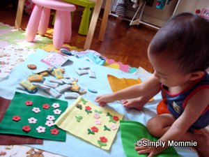 She enjoyed touching the felt and making patterns with the flowers and leaves by just laying the pre-cut flowers and leaves on other pieces of felt and it kept her occupied for a very long time! hee.