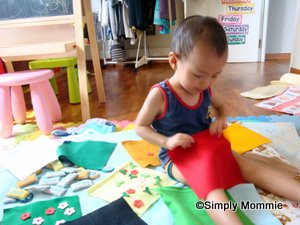 I recently bought some felt to do up a felt board for Alicia and before I started work on it, I thought why not just let her play with the felt as a sensorial activity? π