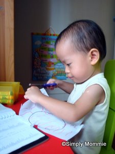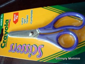 I finally got her a pair of proper scissors. Unfortunately, I couldn’t get the pair I saw at Borders which claims that the blades of the scissors will not cut skin so I had to settle for another pair… and well, I decided on getting Crayola’s. It costs no more than $4, comes in a few different colours and it’s good for both righties and lefties. It’s got a blunt tip but no promises that it won’t cut skin… 😛Â