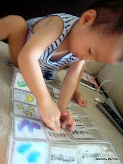 I decided to save printer ink and drew the pictures myself, together with Alicia. Β I realise that she finds it more engaging to watch and guess what mummy is drawing next. So what I did was to draw the pictures on a piece of paper (bearing in mind the size of the pocket chart), paste it on a cereal box then cut out the individual cards – and they’re done! π