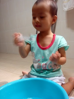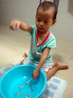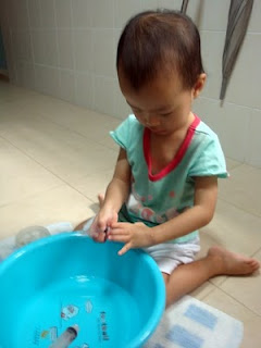 Since she loves syringes, I thought well, why not just let her play with them and figure out how syringes work? It makes a great activity for her since she loves waterplay and syringes have just become the newest addition to the little basin!