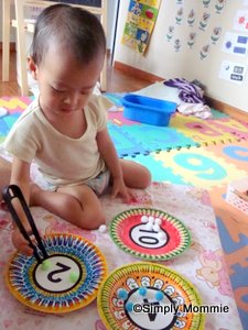 Here’s a simple activity I did with her with just her colourful pompoms, paper plates (with numbers) – (beautifully decorated by my mum, which we pasted on her room wall earlier on when she was a baby) and a pair of tongs (optional).