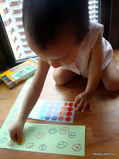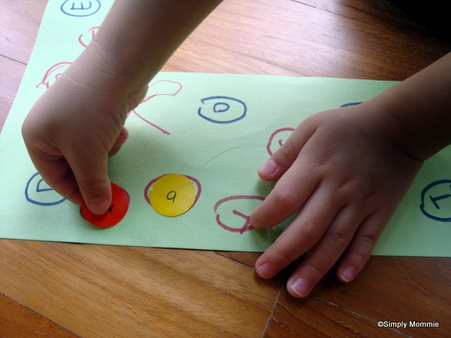 Get your tot to pick out any letter on the paper then look for the matching alphabet on the stickers. (That’s a lot simpler than looking for the alphabet on the paper since the letters are all mixed up!)