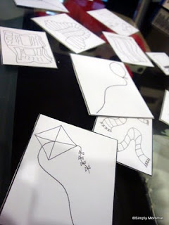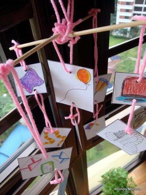 Just get a pair of disposable chopsticks, tape it down, forming a cross. Punch a hole in each card , thread some yarn through and string them onto the chopsticks. Because there are quite a few items, you’d need to have more than one item hanging from each point of the chopsticks (see how I attached them together in the above pics). Lastly, thread more yarn through the X, tie a tight knot and hang it up at the window! ๐