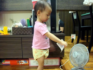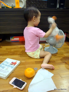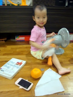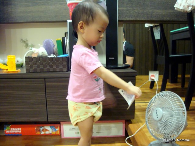 We got a small fan – be careful of those little fingers! – and some random light and heavy items for her for this simple experiment to see what the wind can/ cannot blow away.