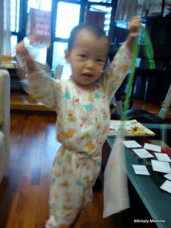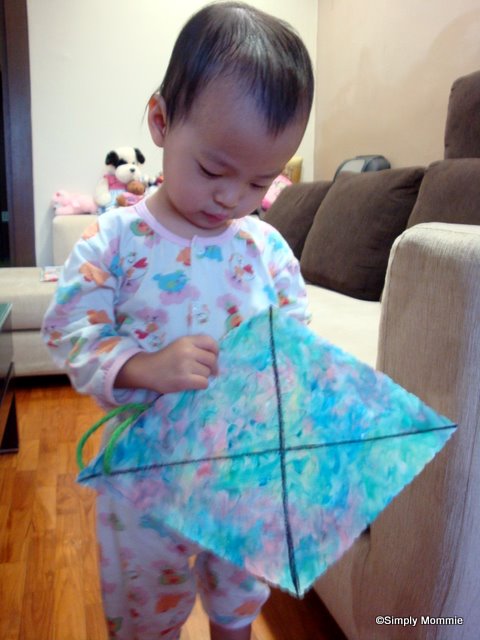Basically, I just got her to do her usual painting one day and I cut out a kite shape later with a craft scissors, drew in the lines, punched a hole and threaded the yarn through. Though it’s not a real kite, she loved it and kept pretending to fly her kite: