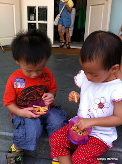 Snack time with another of her friends while waiting for the T-shirt painting