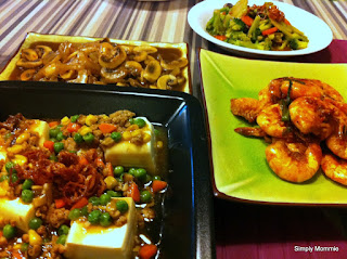 Dishes for the night. That’s white button mushrooms (one of hubby’s fav dishes), a tofu dish (for alicia) and her fav vegetables. Chilli prawns are definitely ours.
